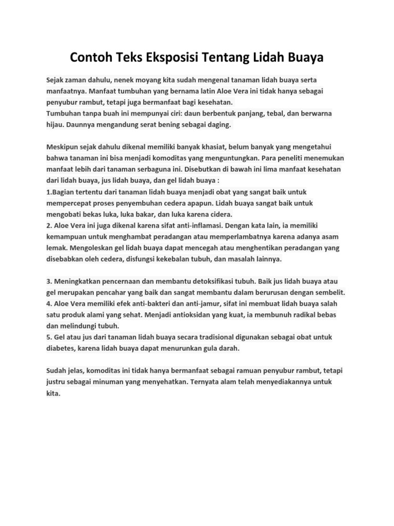 Contoh teks eksposisi singkat beserta strukturnya. Mulai dari ekonomi, lingkungan, kesehatan, hukum, politik. Pengertian, struktur teks eksposisi lengkap ... Langsung ke isi. ... Manfaat Lidah Buaya. Tesis. Sejak zaman dulu, nenek moyang kita telah mengenal manfaat tanaman lidah buaya.. Inilah pembahasan lengkap terkait contoh teks eksposisi tentang manfaat lidah buaya beserta strukturnya. Admin blog Bagikan Contoh 2019 juga mengumpulkan gambar-gambar lainnya terkait contoh teks eksposisi tentang manfaat lidah buaya beserta strukturnya dibawah ini.. Teks eksposisi yaitu paragraf yang mengandung informasi dengan gaya penulisan singkat, padat dan akurat. Berikut contoh teks eksposisi yang mudah dibuat. ... Manfaat Lidah Buaya. Tesis: Sejak zaman dahulu, nenek moyang kita telah mengenal tanaman lidah buaya lengkap dengan manfaatnya..